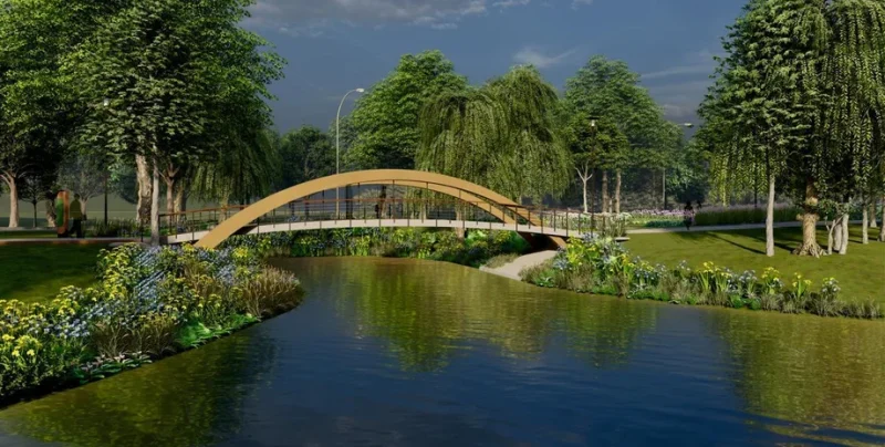 У Києві, на вулиці Прирічній в Оболонському районі, заплановано будівництво нового пішохідного мосту, що стане частиною комплексного оновлення місцевої паркової зони. Ця споруда буде перекинута через наявну заводь, створюючи додаткові можливості для відпочинку та прогулянок мешканців столиці.